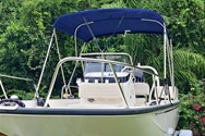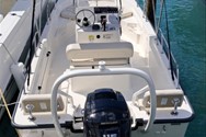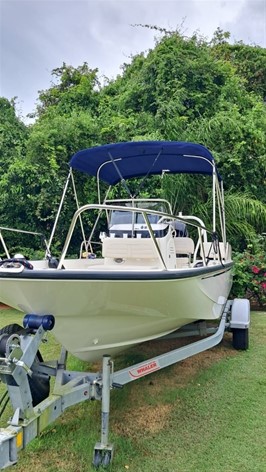 90 explt efi command thrust 4-stroke mercury engine, 25 gallon capacity integrated fuel tanks, analog instrumentation, stainless steel propeller, battery box with hold-down strap in console, classic style navigation lights, bilge pump with float switches (2), hydraulic steering & vessel view mobile. Engine installed and tested, galvanized trailer with swing tongue, spare tire & disc brakes